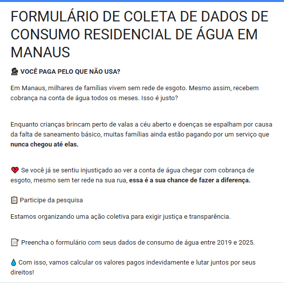 💔 Se você já se sentiu injustiçado ao ver a conta de água chegar com cobrança de esgoto, mesmo sem ter rede na sua rua, essa é a sua chance de fazer a diferença. 📋 Participe da pesquisa