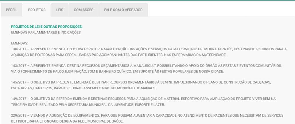 No site da Câmara de Vereadores http://www.cmm.am.gov.br, logo na página principal, ou inicial, há um link que conduz o usuário para ter acesso às informações sobre cada vereador (atuação, perfil, projetos, Leis de sua autoria e, para o politico, principalmente o histórico)