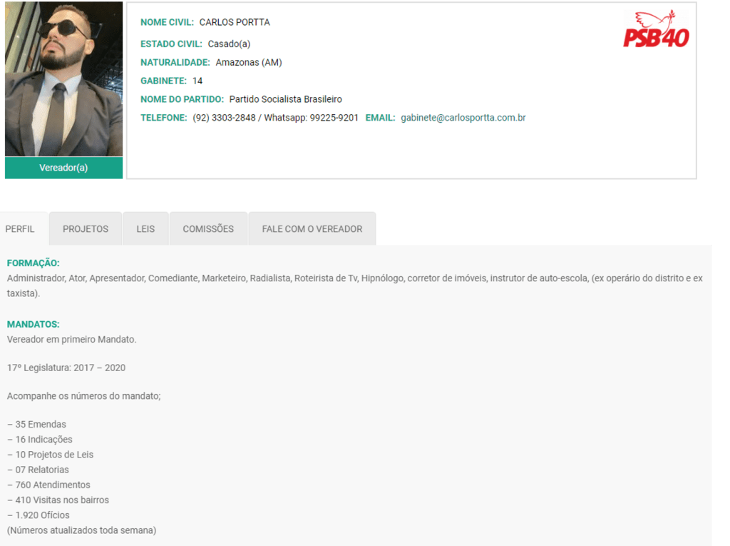 Quero porém, enfatizar o trabalho do vereador Carlos Portta (PSB) e claro, de sua equipe, pois o mesmo, além de atualizar os Projetos de Lei e as Leis de sua autoria, mesmo que o espaço não esteja preparado para receber outras informações em seu perfil, o vereador coloca naquele espaço praticamente um resumo de sua prestação de contas, veja abaixo: