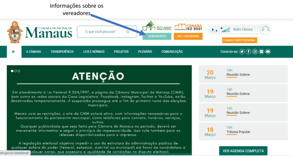 Assim, a página da Câmara Municipal de Manaus (no caso, o site da da Câmara), em atendimento à Lei Federal 9.504/1997, ) assim como as redes sociais da Casa Legislativa estão desativadas temporariamente, dessa forma, os vereadores não podem atualizar os seus perfis no site.